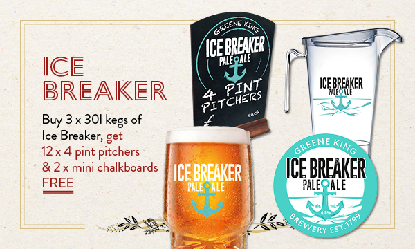 Ice Breaker Buy 3 x 30l kegs of Ice Breaker, get 12 x 4 pint pitchers & 2 x mini chalkboards FREE 12 x 4 pint pitchers & 2 x mini chalkboards FREE 12 x Ice Breaker 4 pint pitchers & 2 x mini chalkboards, when you buy 3 x 30l kegs of Ice Breaker. 100 deals available from 3rd October 2022. Max 1 deal per customer. |