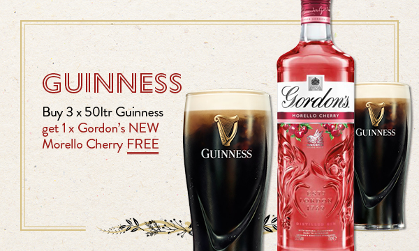 FREE 70cl bottle of Gordon's Passionfruit or NEW Morello Cherry, when you buy 3 x 50ltr Guinness. 200 deals available from 3rd October 2022. Max 2 deals per customer.