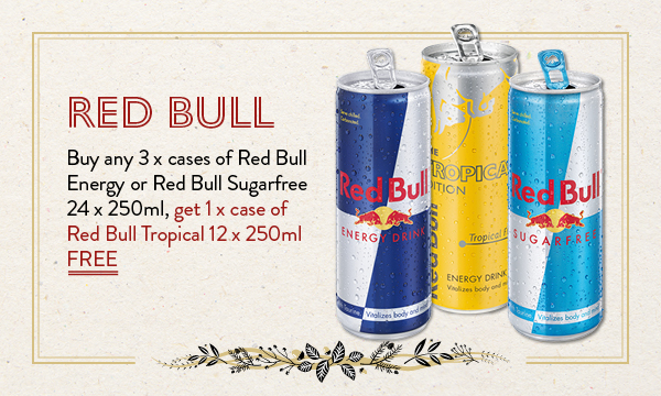 Buy any 3 x cases of Red Bull Energy or Red Bull Sugarfree 24 x 250ml, get 1 x case of Red Bull Tropical 12 x 250ml FREE