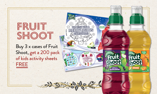 FREE 200 x kid's activity sheets, when you buy any 3 x cases of Fruit Shoot. 100 deals available from 3rd October 2022. Max 2 deals per customer.