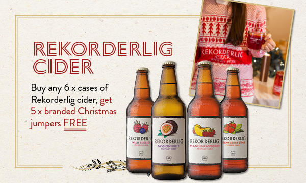 Rekorderlig Cider Buy any 6 x cases of Rekorderlig cider, get 5 x branded Christmas jumpers FREE 5 x Rekorderlig Branded Xmas jumpers FREE 5 x Rekorderlig Christmas jumpers, when you buy any 6 x cases of 15 x 500 Rekorderlig cider. 50 deals available from 31st October 2022. Max 1 deal per customer. |