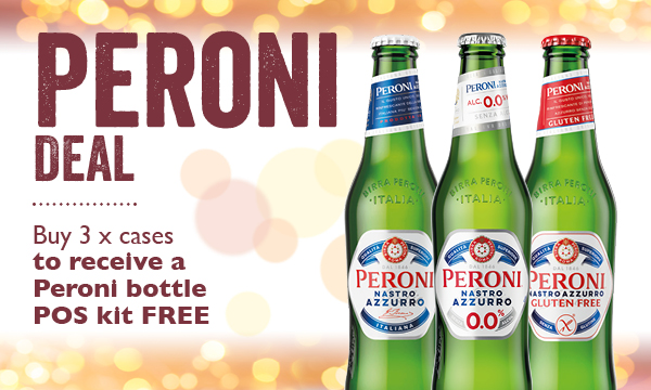 Buy 3 x Peroni Nastro Azzurro, Peroni Gluten Free or Peroni 0.0% 330ml (24pk) receive a Peroni Bottle POS kit