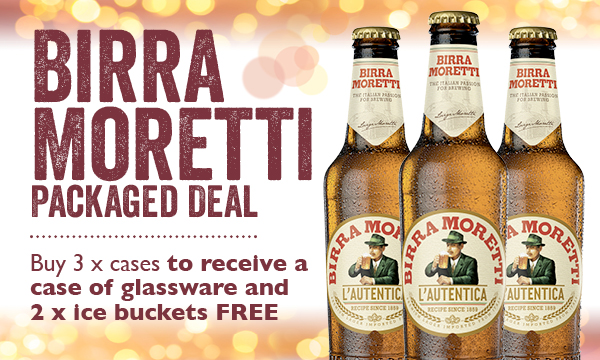Buy 3 cases of Moretti and receive 1 case of glassware and 2 ice buckets