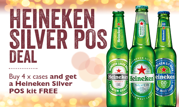 Heineken Silver POS Deal buy 4 cases get a brands funded Silver POS kit 2 x Heineken Ice Buckets - 20 x Table talkers - 2x Back Bar displays - 400 Beer coasters