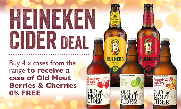Heineken Cider Deal PPC deal – buy 4 cases from the HUk range of packaged cider get a case of Old Mout B&C Alcohol Free, free – Include all Old Mout family and Bulmer’s – 200 deals – 4 cases mixed of 12 bottels from the range above get a free case 12 bottles of Old Mout Berries and Cherries 0.0 FREE
