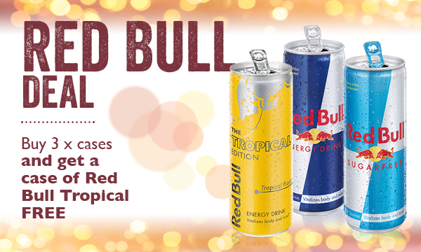 Red Bull Deal Buy 3 cases across Red Bull Energy and Red Bull Sugarfree and get a case of Red Bull Tropical free 1 x Red Bull Tropical 12 x 250ml case