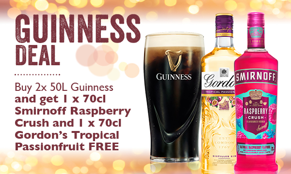 buy 2x 50L Guinness, get 1x 70cl Smirnoff Raspberry Crush & 1x 70cl Gordon's Tropical Passionfruit free