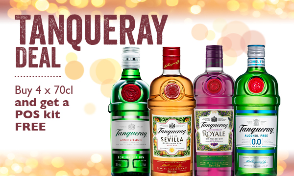 Tanqueray Deal buy 4x 70cl, get POS kit free 1x Tanqueray Tree, 6x Tanqueray Copa glasses